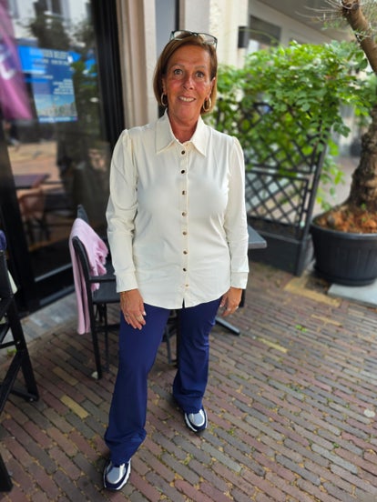 De Travel Blouse Nayette Offwhite van Maicazz is een elegante basisblouse met een verfijnde uitstraling. Dankzij de soepele travelstof en goudkleurige knopen is dit een tijdloos item voor elke gelegenheid!