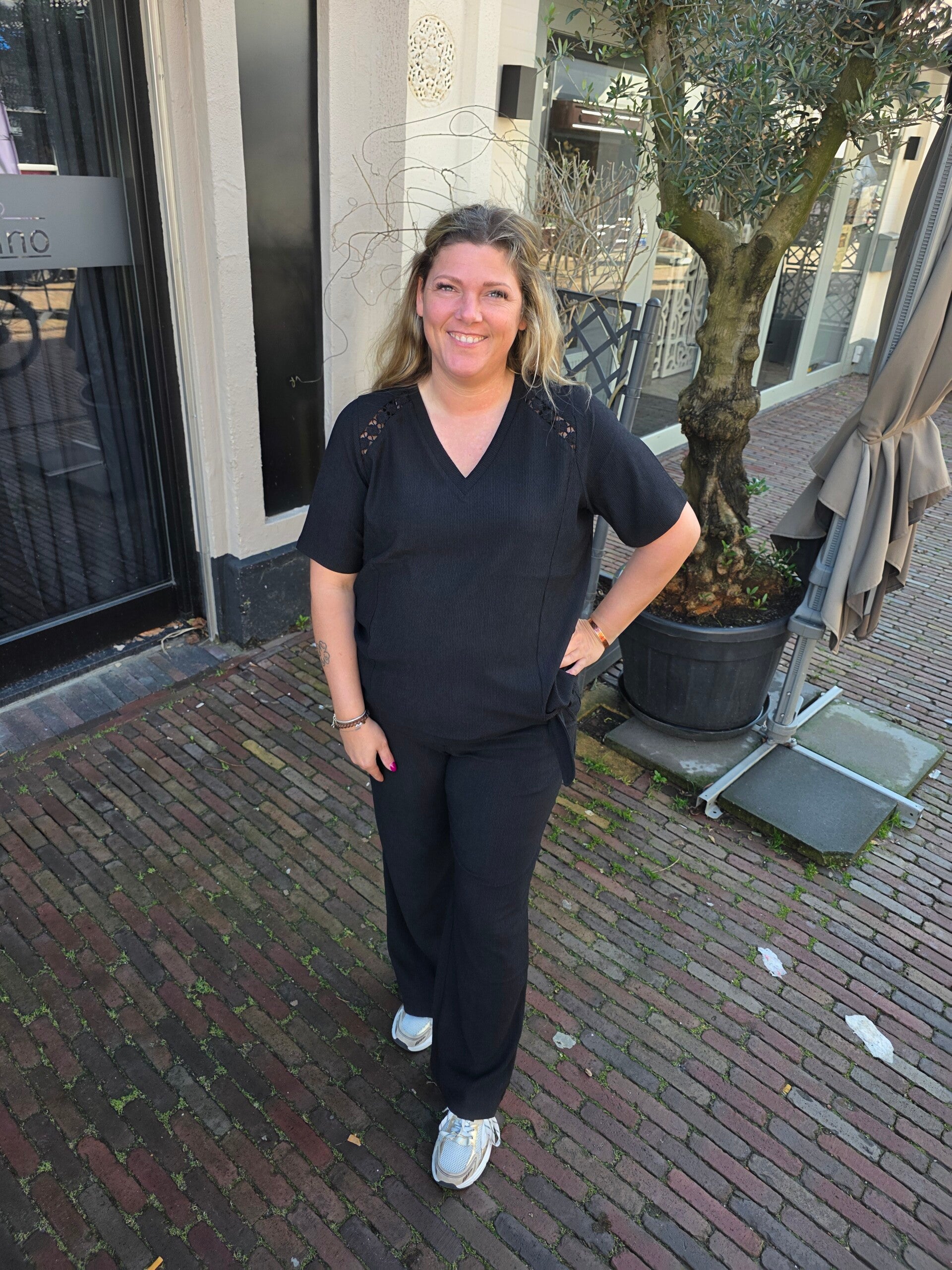 Een moderne essential met een zachte en vrouwelijke uitstraling. De Jaya top heeft een losvallende pasvorm met een flatterende V-hals en korte mouwen, uitgevoerd in een comfortabele, licht gestructureerde kwaliteit die soepel valt. De verfijnde kanten inzet op de schouders en het strikdetail aan de zijkant geven het ontwerp een speelse en elegante touch.